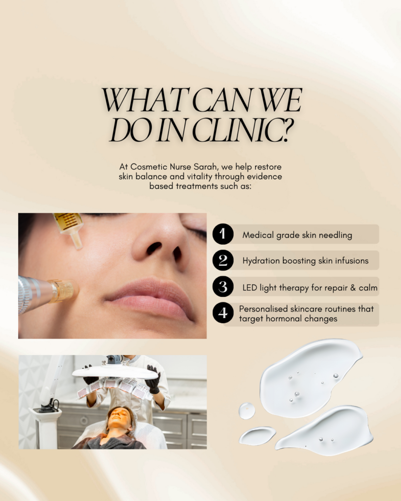 Skin health is a critical part of the process. Targeted skincare supports skin resilience, hydration and glow while the body undergoes metabolic changes.